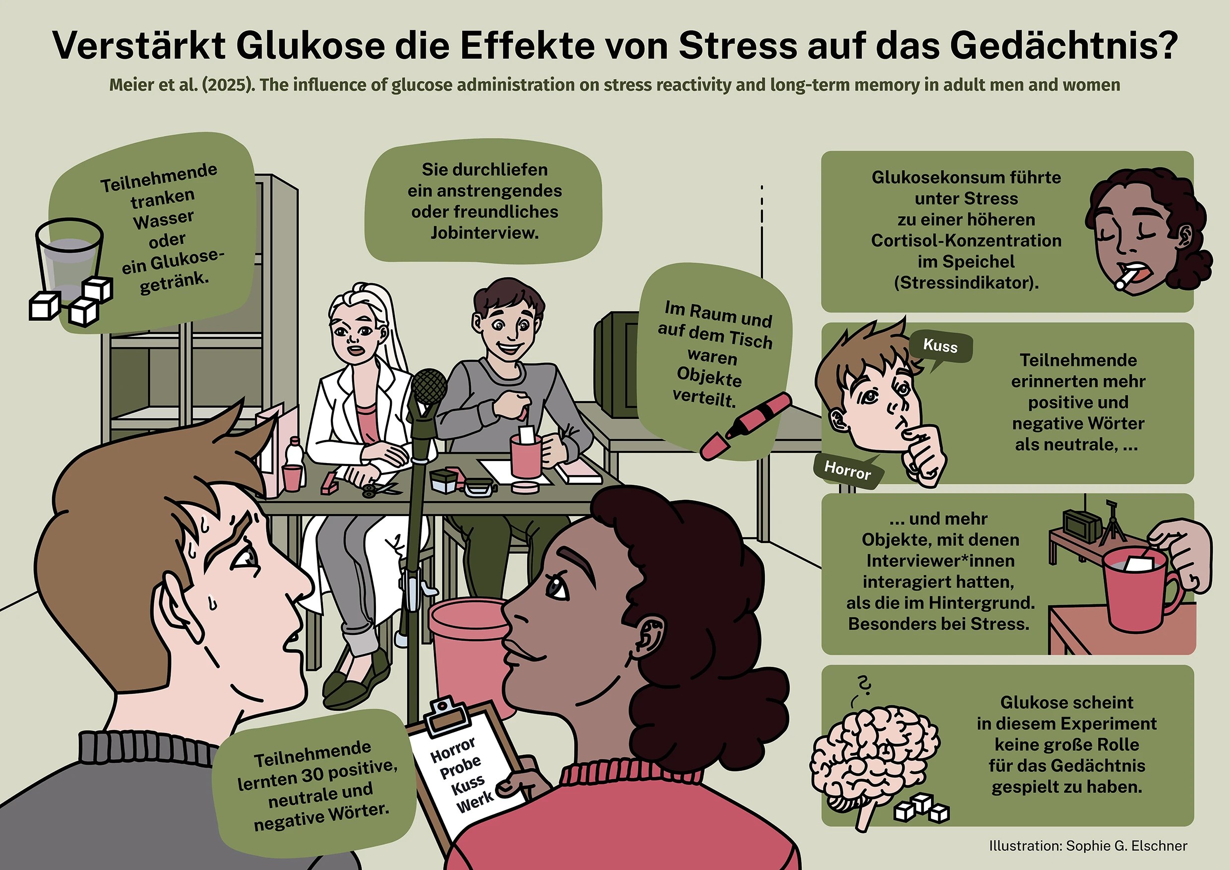 Im Sommer habe ich wieder ein neues Graphical Abstract für Dr. Maria Meier und Kolleg*innen gemacht. Dieses Mal für die Studie „The Influence of Glucose Administration on Stress Reactivity and Long-Term Memory in Adult Men and Women”, von der es bereits einen Preprint gibt. Was ein Preprint ist, erkläre ich euch in diesem Blogpost zu meiner letzten Illustration für sie.